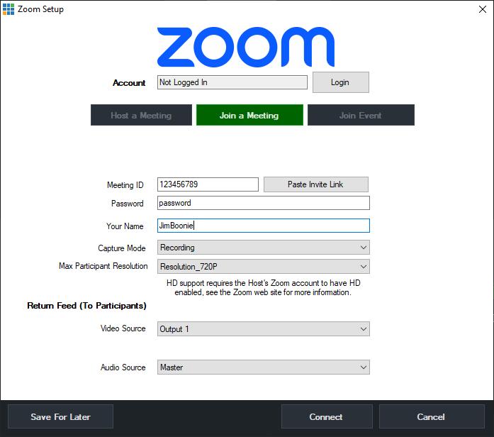 Optionally click Save For Later if you only wish to save the settings but not connect to a meeting at this time.