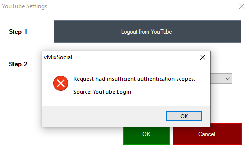 You may encounter the following error when attempting to login to YouTube from either the vMix stream settings window or vMix Social window: